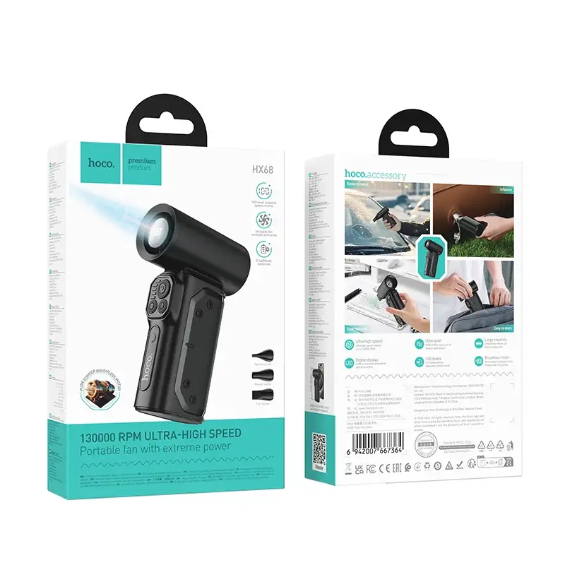 Specification Details Brand Hoco Model HX68 Flujo Fan Type High-Speed Handheld / Jet Fan Motor Type Brushless High-Performance Motor Speed Control Stepless / 1-100 Level Adjustment Display LED Digital Display (Speed & Battery) Charging Port USB Type-C Battery Capacity High Capacity (e.g., 3000mAh – 4000mAh)* Material Premium ABS + PC Wind Speed Ultra High Velocity (up to 9-19m/s)* Color Titanium Grey / Metallic Blue (Check availability)