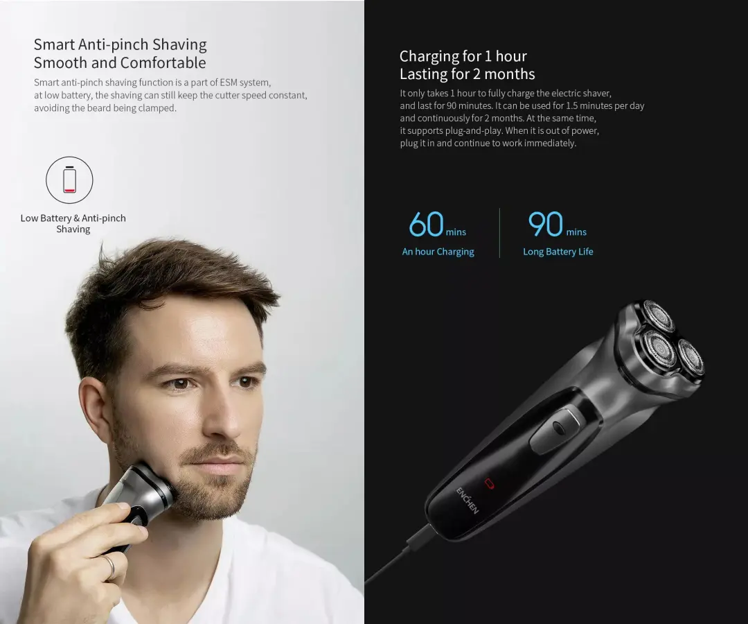 The compact and lightweight body ensures a firm grip. As a result, the Xiaomi Enchen Blackstone Shaver is ideal for daily grooming and travel use.